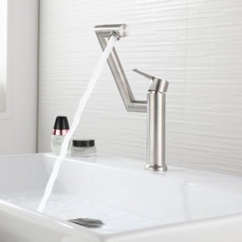 حنفية حمام عصرية بفتحة واحدة ومقبض واحد مثبتة على السطح، مصنوعة من الفولاذ المقاوم للصدأ المصقول بتصميم قابل للطي وصمام سيراميك مع نظام قياس